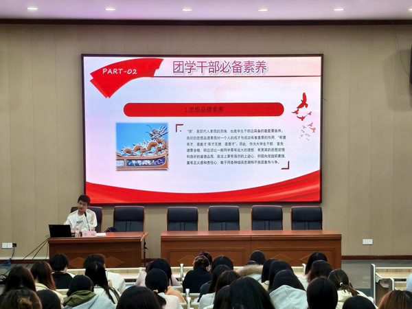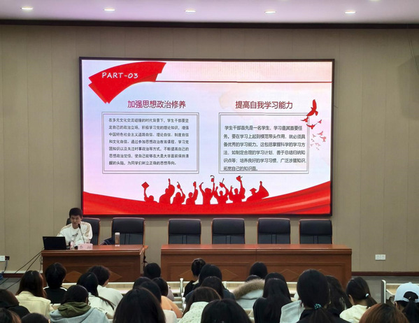 随后,查烁结合工作实际,重点阐述了学生干部必须具备的三项核心素质:一是过硬的思想道德修养,筑牢理想信念根基;二是强烈的责任担当意识,积极主动履职尽责;三是持续学习与自我更新的能力,不断适应发展需要。他强调,素质是能力的基础,学生干部应在日常学习与工作中自觉锤炼品格、提升境界。